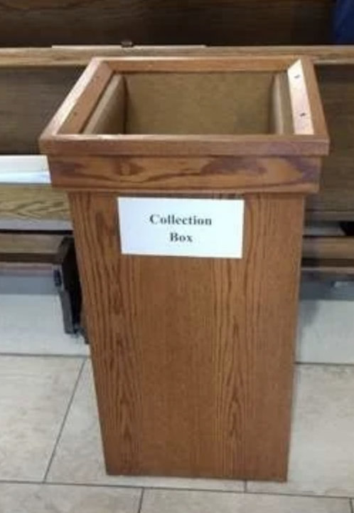 Please use the Collection Box pictured below in the back of Church if you prefer.